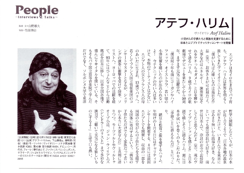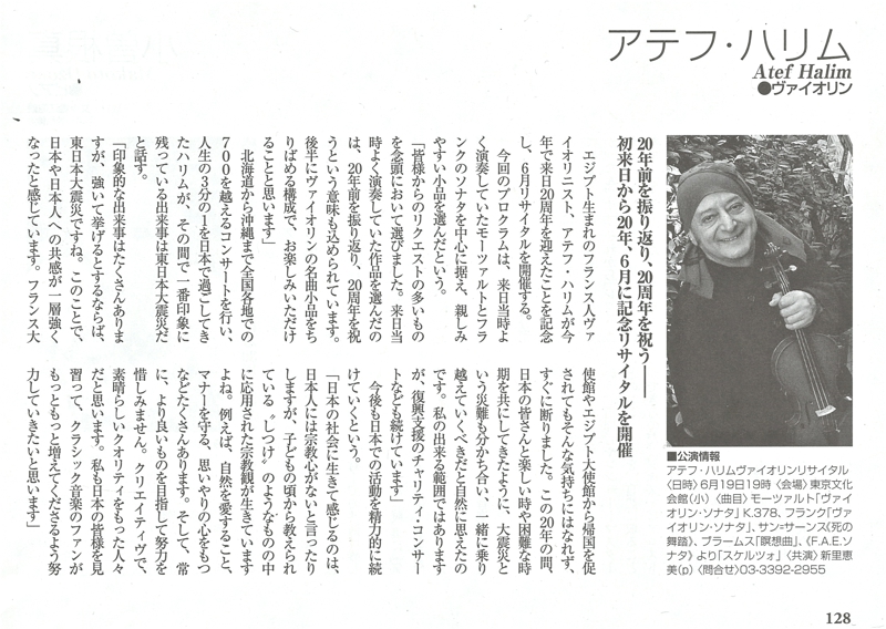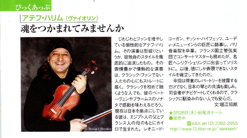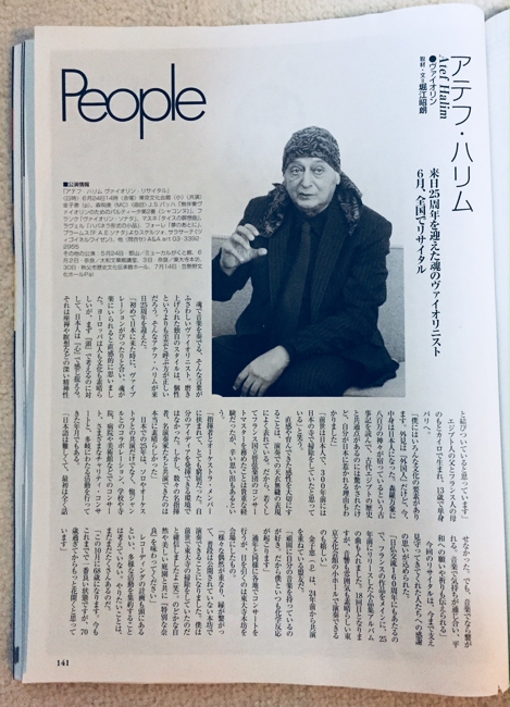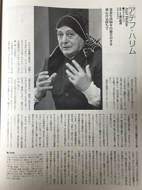 写真をクリックすると大きくなります「ハリムの恩恵に預かれる私たち日本人は幸せだ」弦楽器マガジン「サラサーテ」Vol.19の巻頭グラビアとインタビュー記事2ページに渡って掲載されました。記事を読む
