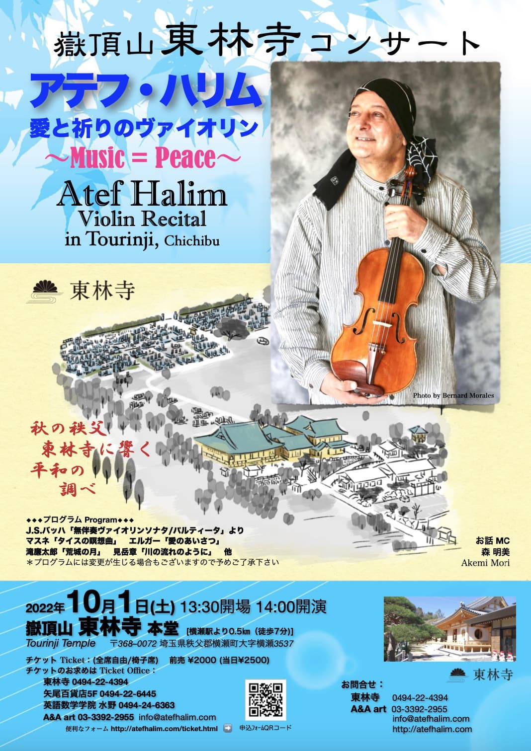 2018年秋より2年ごとに開催している東林寺でのアテフ・ハリムのコンサート。エジプト生まれのフランス育ちのアテフさんですが、前世は日本人(300年前にお寺のお掃除をしていたかも)というほどの日本ファン。様々なバックグラウンドを持つアテフさんにとって、ヴァイオリンを奏でることは平和を奏でること。〜Music = Peace〜なのです。世界平和と皆様の健康を祈りながら、慈愛に満ちた温かいヴァイオリンの音色に包まれる安らぎのひと時をお過ごしください。