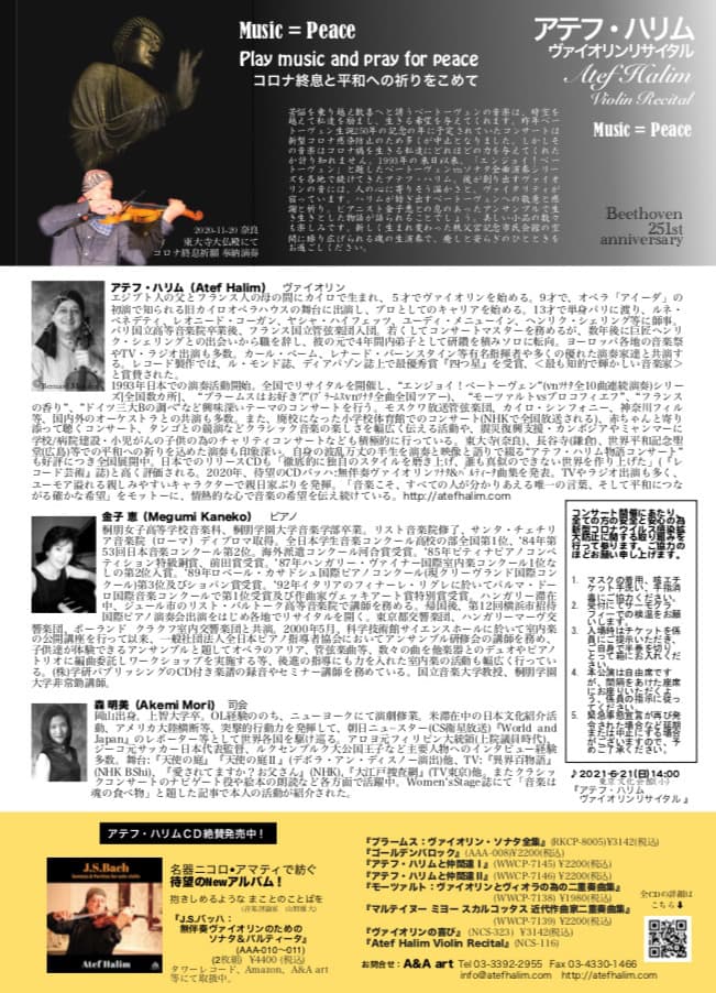 来日以来、「エンジョイ!ベートーヴェン」と題したベートーヴェンvnソナタ全曲演奏シリーズを各地で続けてきたハリムがお届けするのは、今回第4番と第7番のソナタ。ハリムが紡ぎ出すベートーヴェンへの敬意と感謝と祈り。ピアニスト金子恵との息のあったアンサンブルでお楽しみください。