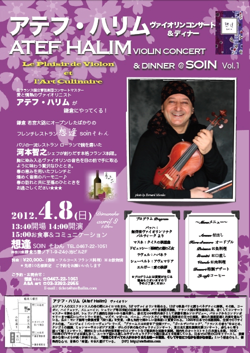 アテフ・ハリムの鎌倉での演奏は初めて。日本の文化を愛するフランス人ヴァイオリニストが、春の喜びと共に、フランス人作曲家の曲やバッハの名曲の数々を奏でます♪