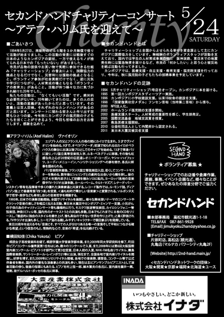 カンボジアの医療支援・自立支援・教育支援・孤児院支援を続けてきたセカンドハンド設立20周年を記念したチャリティーコンサート。10周年記念でも演奏したハリム氏を迎えます。是非ご参加ください!