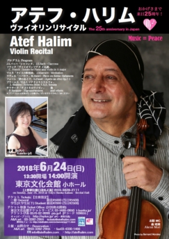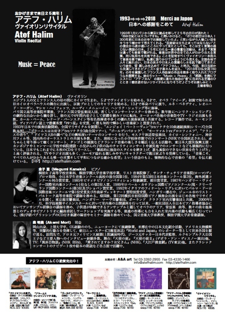 1993年1月にパリから東京に拠点を移して25年の月日が流れた!「四半世紀とはスゴいですね」と問いかけると、「ボクの前世は日本人!300年前に日本のお寺でお掃除していたよ」と笑いながら人懐こい目をキラキラ輝かせて答えてくれる。“芸術家は立ち止まってはならない”との信念から遥か遠いところにやって来たとしても、そこは全く言葉の通じない異国の日本。25年にわたる一連の豊富な活動は、まるで『言葉は違っても音楽で繋がれる。音楽は世界中の全ての人がわかり合える言葉、同じ気持ちを共有できる』ことを証明すべくヴァイオリン一本抱えて音楽を奏で続け、私達に語りかけているようにも思える。全国各地で人々と触れ合い、日本の良さや日本人の素晴らしさを肌で感じてきたという彼を、皆 親しみを込めて「アテフさん」と呼ぶ。今回、来日当初から共演してきたピアニスト金子恵さんを迎え、「2018年日仏交流160年」の年を意識したフランス人作曲家の作品を数多く取り入れたプログラムを展開する。