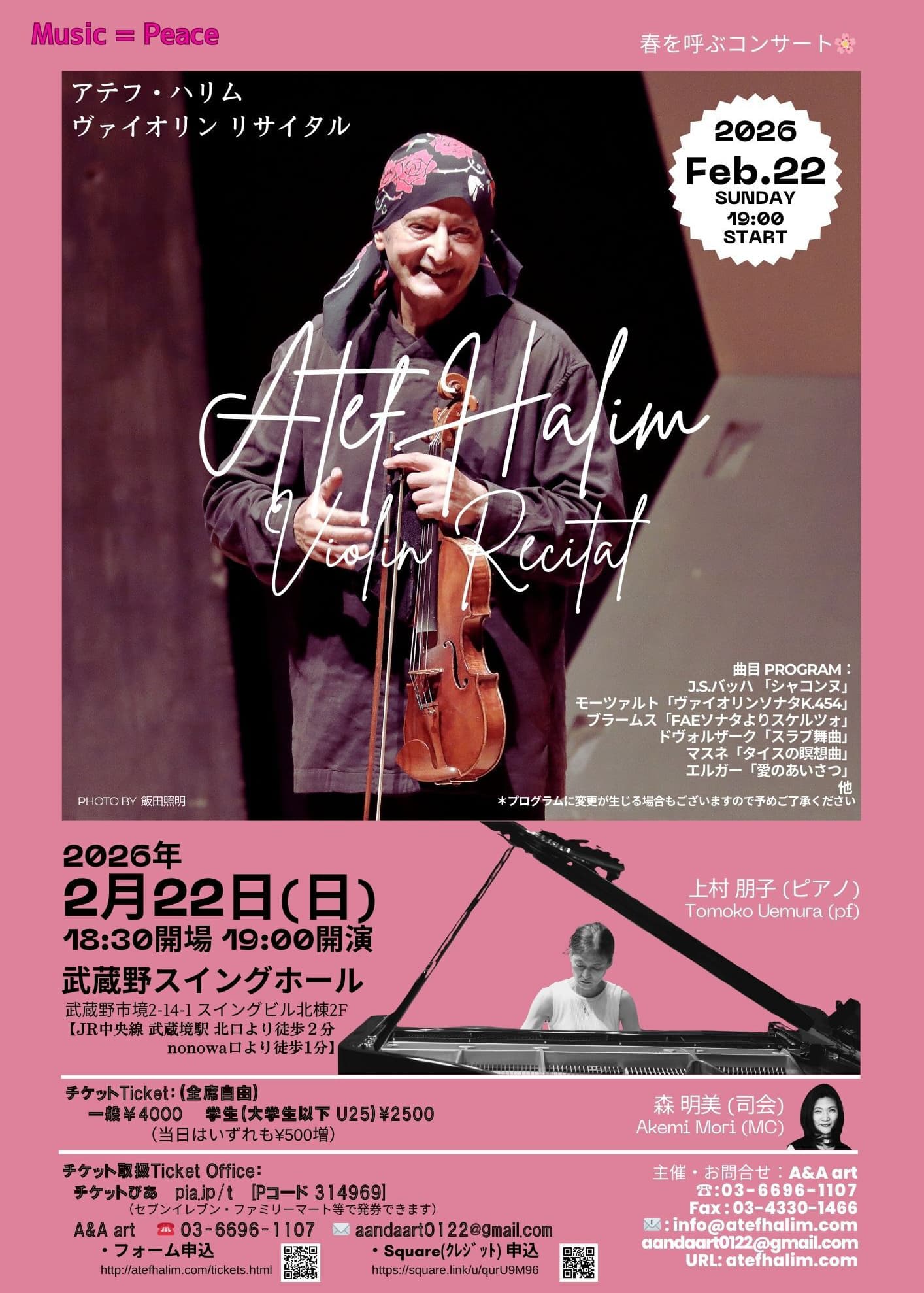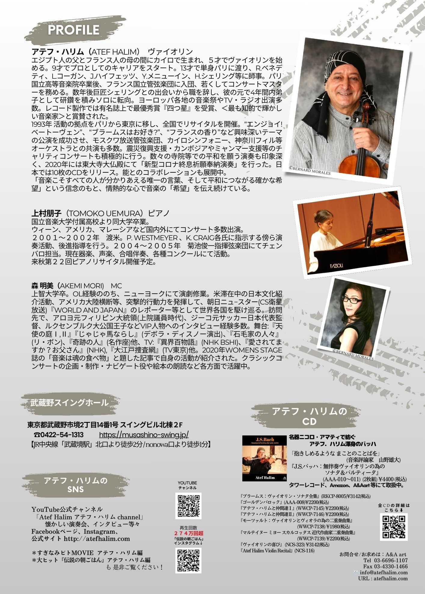 愛と情熱溢れるヴァイオリニスト アテフ・ハリムがお届けする春を呼ぶコンサート。モーツァルト生誕270年を祝うソナタやチャーミングな小品の数々。美しいヴァイオリンとピアノのメロディをお楽しみください♪
