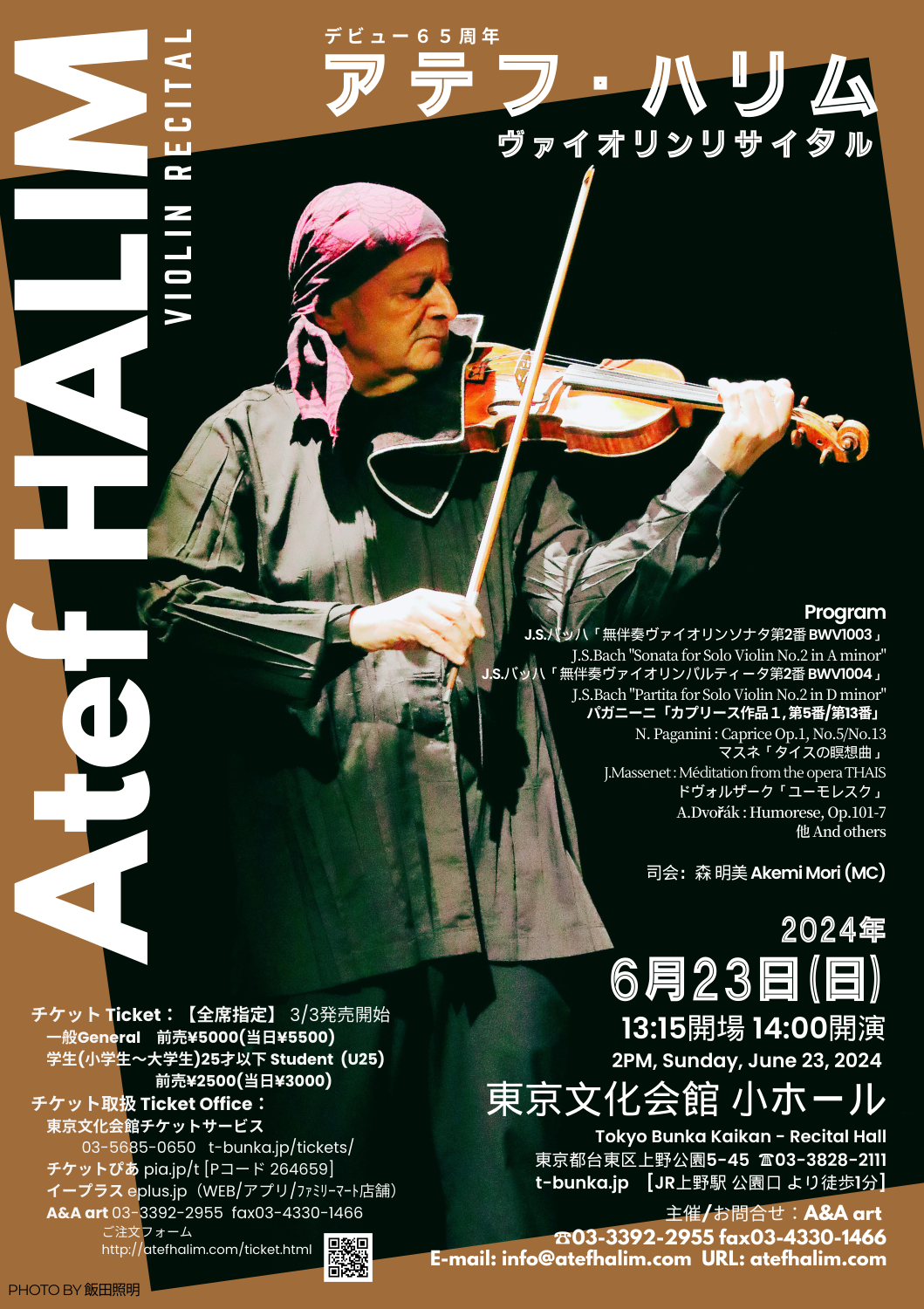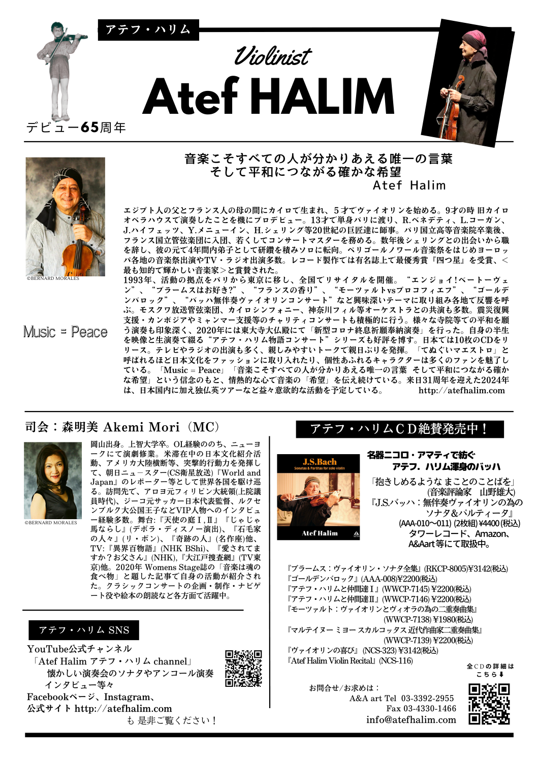 エジプト人の父とフランス人の母のもとにカイロで生まれ、5才でヴァイオリンを始め、9才でデビュー。今年「デビュー65周年」を迎えたアテフ・ハリム。13才で単身パリに渡り、パリ国立高等音楽院卒業後、フランス国立管弦楽団入団、若くしてコンサートマスターを務める。巨匠シェリングとの出会いから職を辞してソリストに転向。ヨーロッパでの活躍後、日本に拠点を移し31年。日々自らの音楽を求めて歩みを続けている。ヴァイオリンを奏でることは平和を奏でること。ハリム氏のヴァイオリン人生を映し出すような渾身の演奏をお楽しみに! Music = Peace